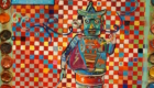 Checkered tablecloth (gingham pattern) series, with oils painted directly onto lazer print cut-outs, and wax encaustic hot oil bonding, fused with plaster on burlap, panel and card board.